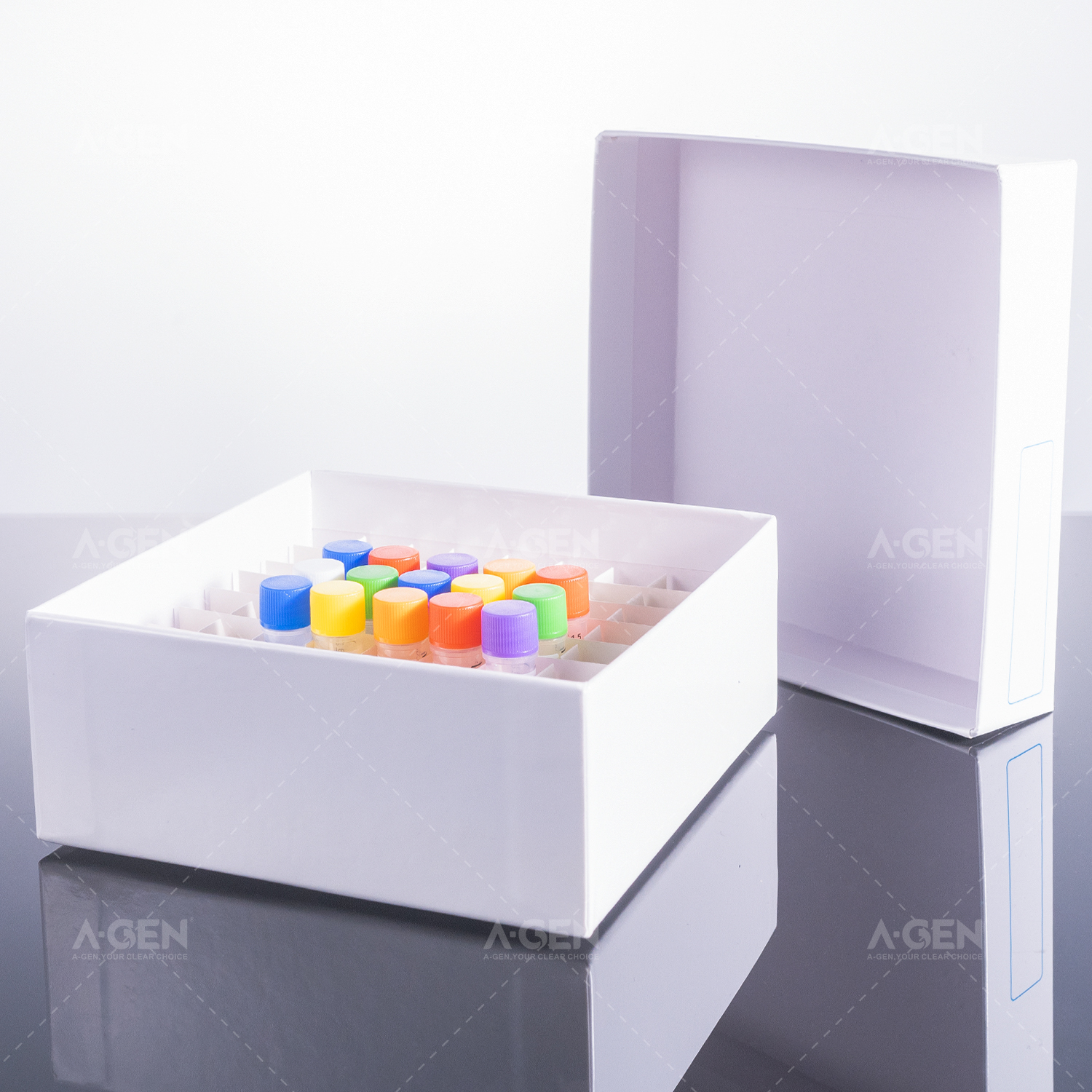 Aijin Biotech PC Freezing Box is available in multiple colors for easy differentiation. The box body has pre-set positioning marks, and the unique gap and line design facilitates rapid refrigeration. One corner of the box body is cut-away, which facilitates quick and accurate placement of the lid. It is suitable for storage in ultra-low temperature refrigerators and liquid nitrogen environments.